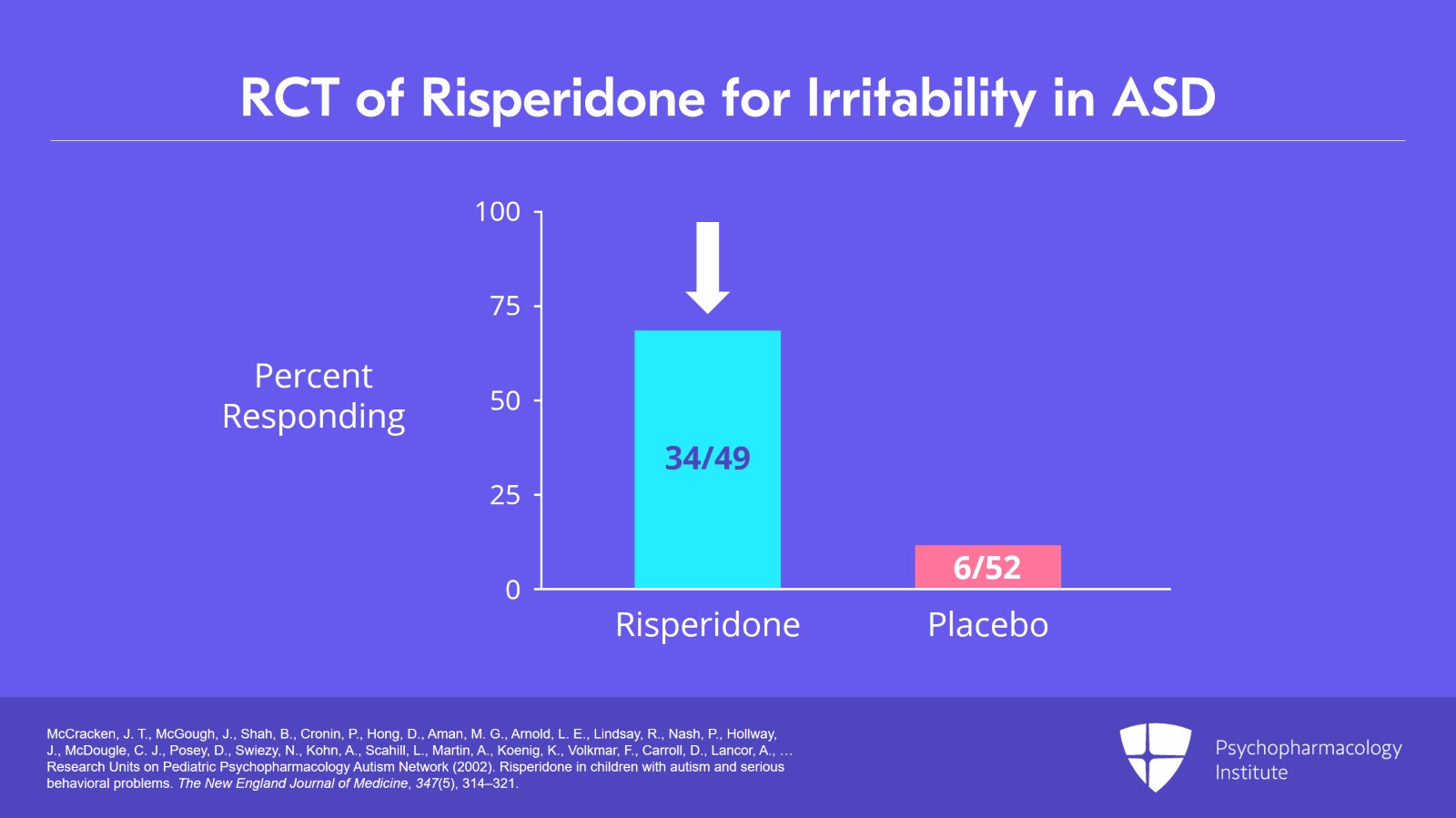 This figure I want to show you here has to do with showing the percent of subjects that responded taking risperidone versus placebo. You'll see 34 out of the 49 subjects taking risperidone were responders as compared to only six taking placebo. So certainly, a positive trial attesting to the benefit of risperidone.