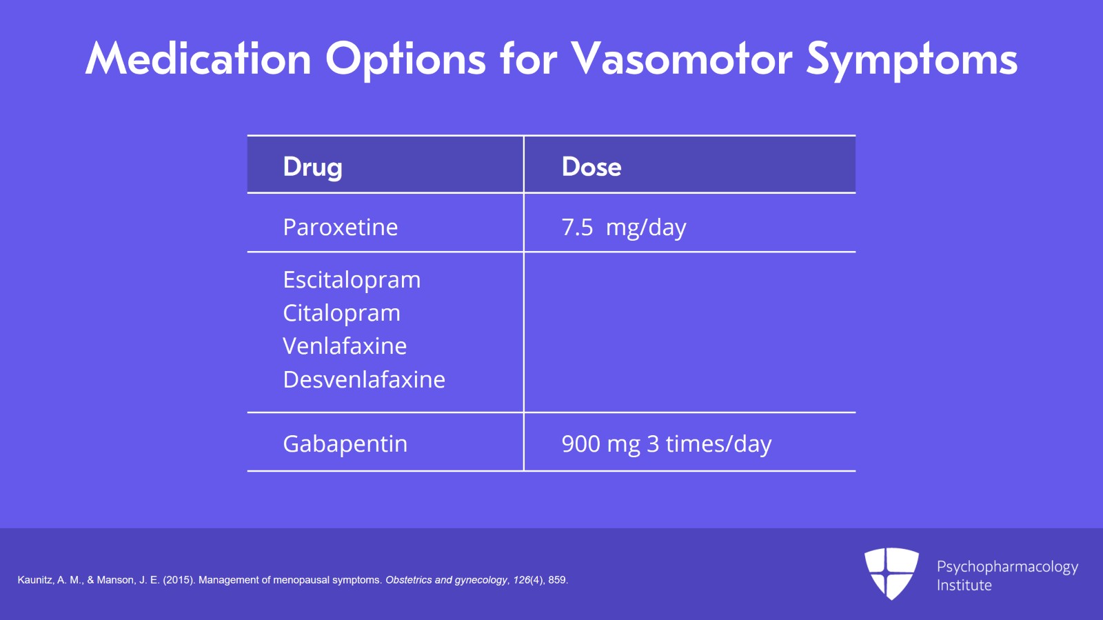 Moving on, when choosing among medication options for perimenopausal depressed women with vasomotor symptoms, a number of medications have been shown to reduce the frequency of vasomotor symptoms. Paroxetine is the only FDA-approved antidepressant at a low dose of 7.5 mg per day to treat perimenopausal vasomotor symptoms. Escitalopram, citalopram, venlafaxine, desvenlafaxine have also been shown to improve symptoms of perimenopause. And gabapentin 900 mg 3 times a day can also reduce the frequency of vasomotor symptoms in perimenopausal women.