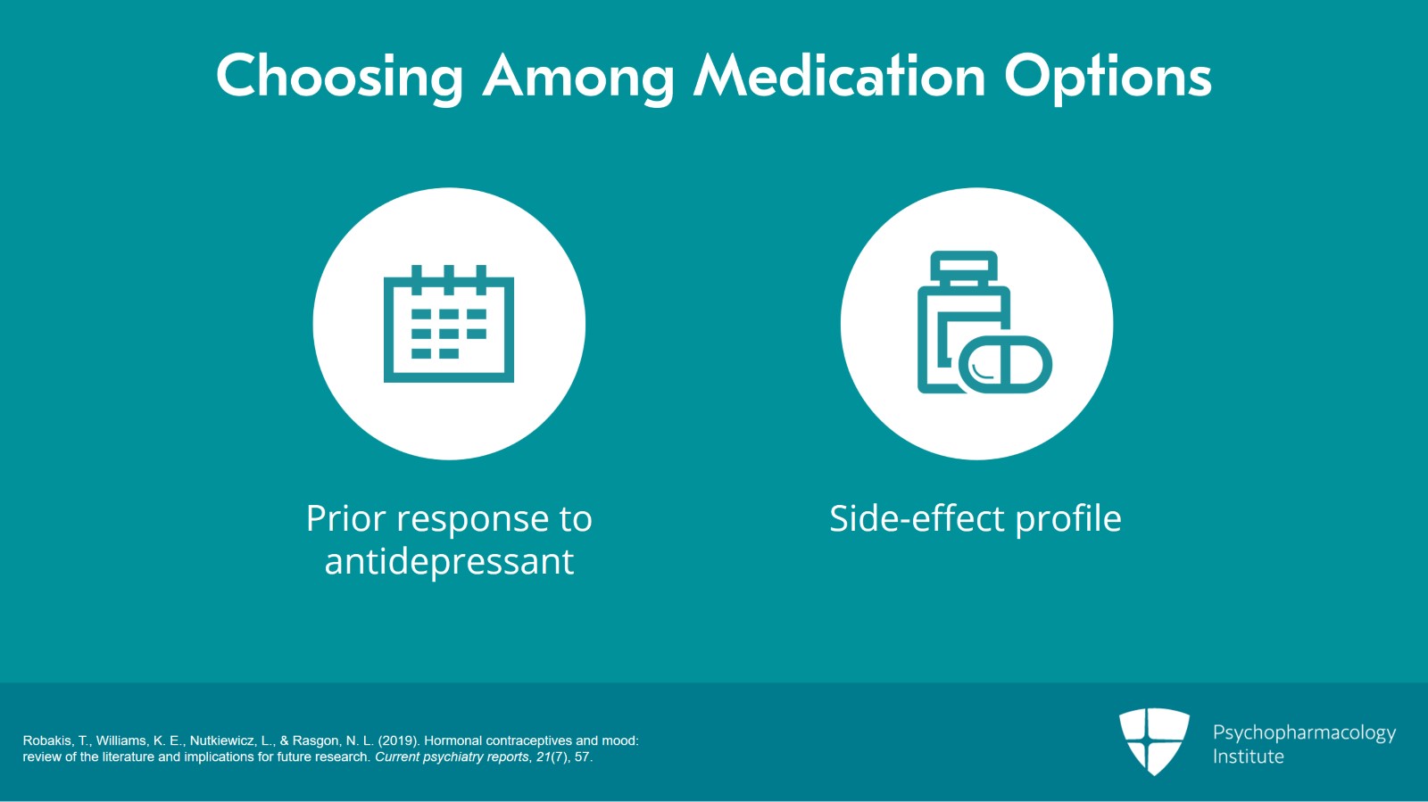 Clinical experience suggests that the choice of treatment ought to be based on first of all prior history of response to an antidepressant in those cases of women with a history of depression and possible response to either an SSRI or an SNRI. And also, choice of treatment should be based on the side effect profile of the available options.
