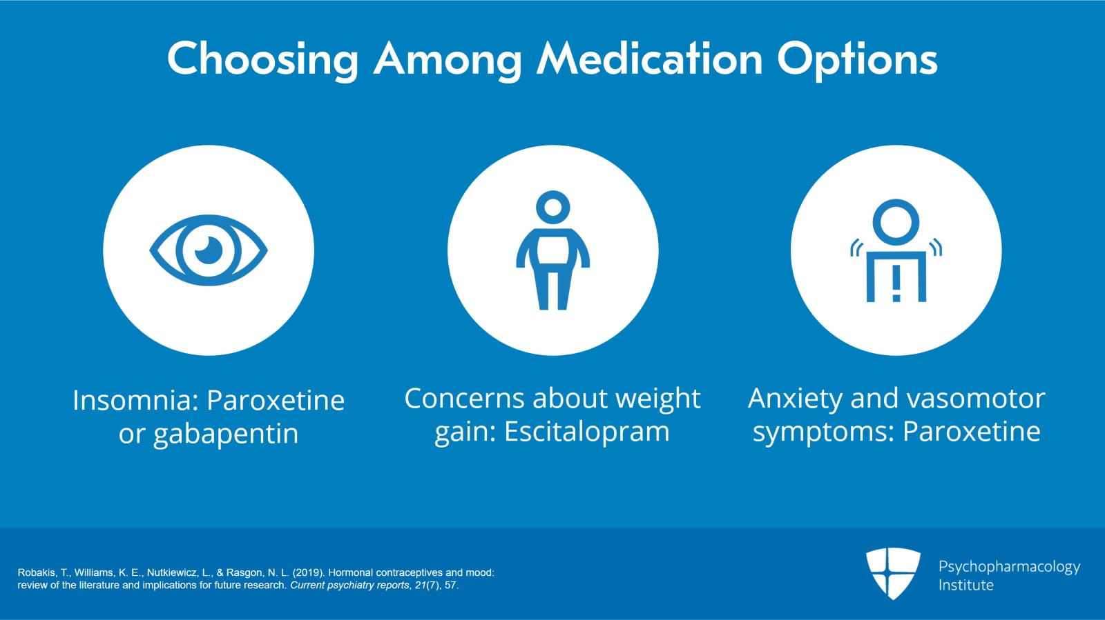 For women with insomnia, one might move towards paroxetine or gabapentin. For women with concerns about weight gain, escitalopram might be preferred. For women with anxiety associated with vasomotor symptoms, paroxetine might also be a good choice.