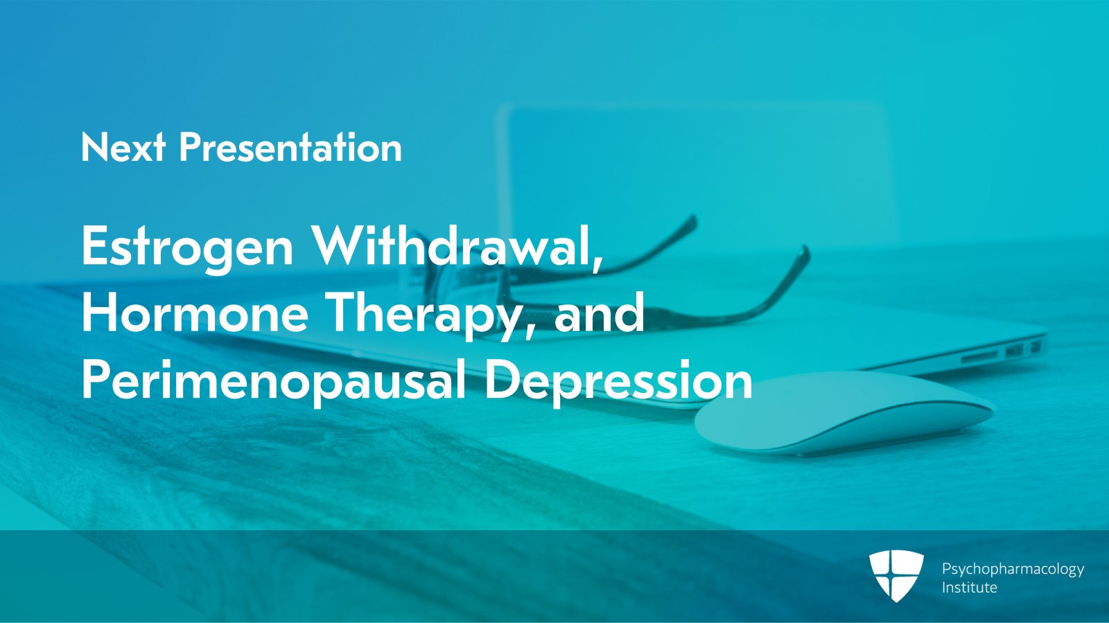 So what are our takeaway key points at this part of our presentation? First of all, at this time, antidepressants are the treatment of choice for perimenopausal women with major depression. Secondly, for women not meeting criteria for major depression, hormonal treatments may be considered to address underlying menopausal symptoms like hot flashes, insomnia, sexual disturbances and other related symptoms. All of which may be responsible for secondary depression.