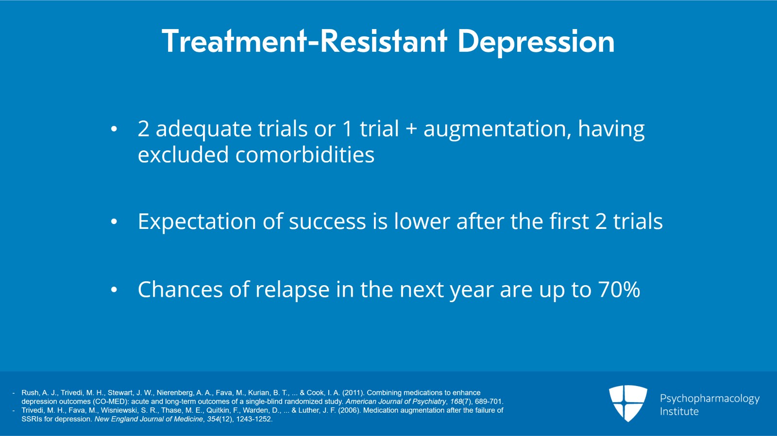 - Trivedi, M. H., Fava, M., Wisniewski, S. R., Thase, M. E., Quitkin, F., Warden, D., … & Luther, J. F. (2006). Medication augmentation after the failure of SSRIs for depression. New England Journal of Medicine, 354(12), 1243-1252.