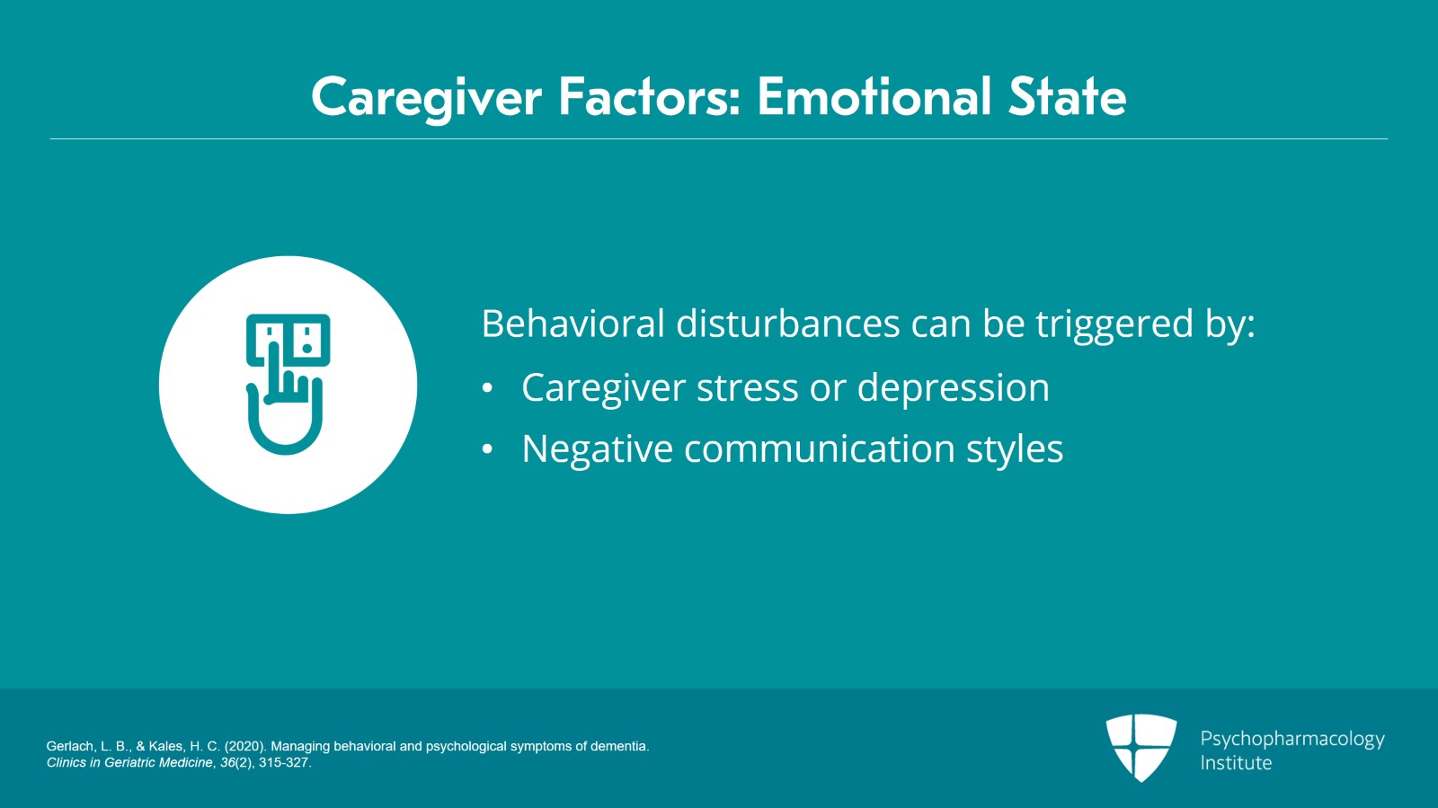 We know that these types of behavioral disturbances in dementia can often be triggered or exacerbated when a caregiver is stressed or depressed.