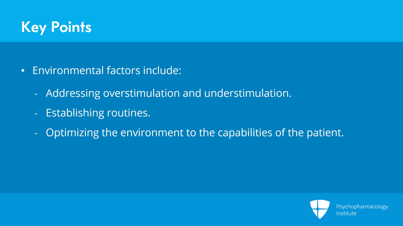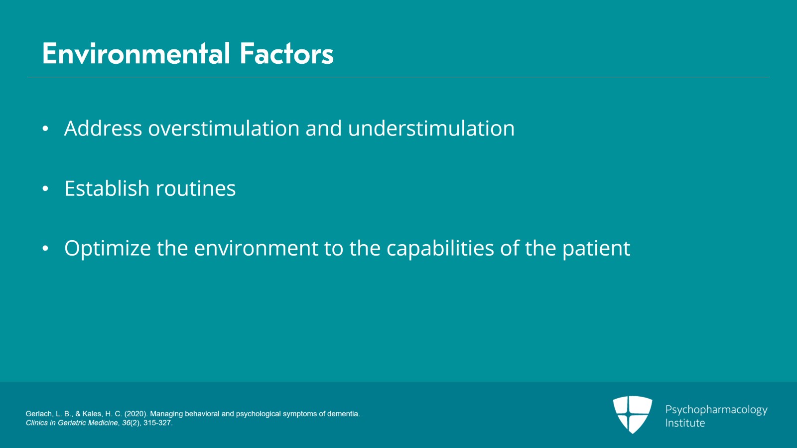 Lastly, environmental factors can include addressing both over- and under-stimulation in the environment, establishing routines, and optimizing the environment to the capabilities of the person with dementia.