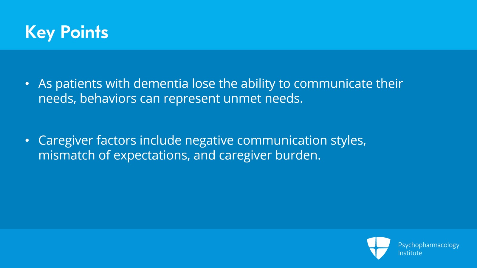 And as patients with dementia may lose the ability to communicate their needs verbally, we really need to have a trial and error approach to try to learn what these behaviors might be representing. Is the patient thirsty? Are they hungry? Are they having a difficulty with toileting? Are they under-stimulated?