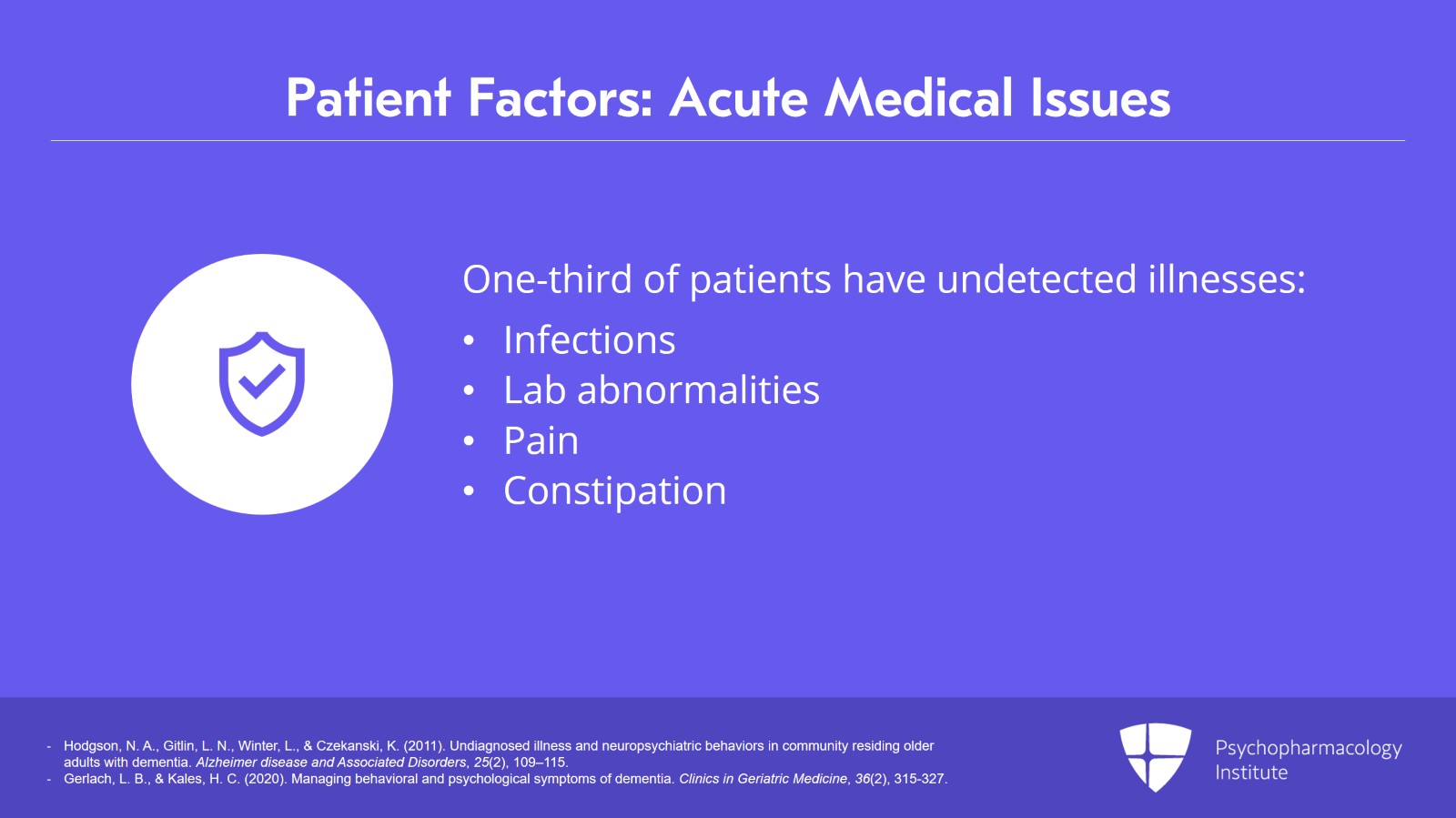 - Hodgson, N. A., Gitlin, L. N., Winter, L., & Czekanski, K. (2011). Undiagnosed illness and neuropsychiatric behaviors in community residing older adults with dementia. Alzheimer disease and Associated Disorders, 25(2), 109–115.