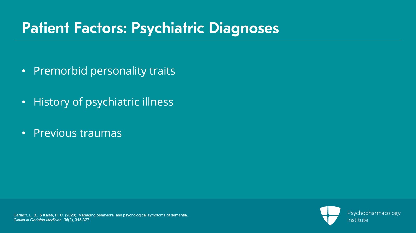 Other things to think about with the person with dementia is that the person with dementia brings themselves with the diagnosis and meaning that premorbid personality traits, history of psychiatric illness, previous traumas, these things can still persist even as a patient has memory loss and cognitive impairment.