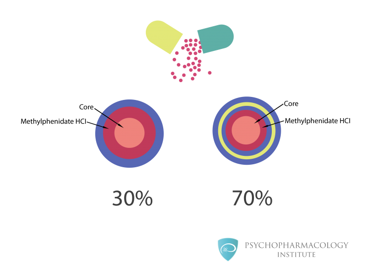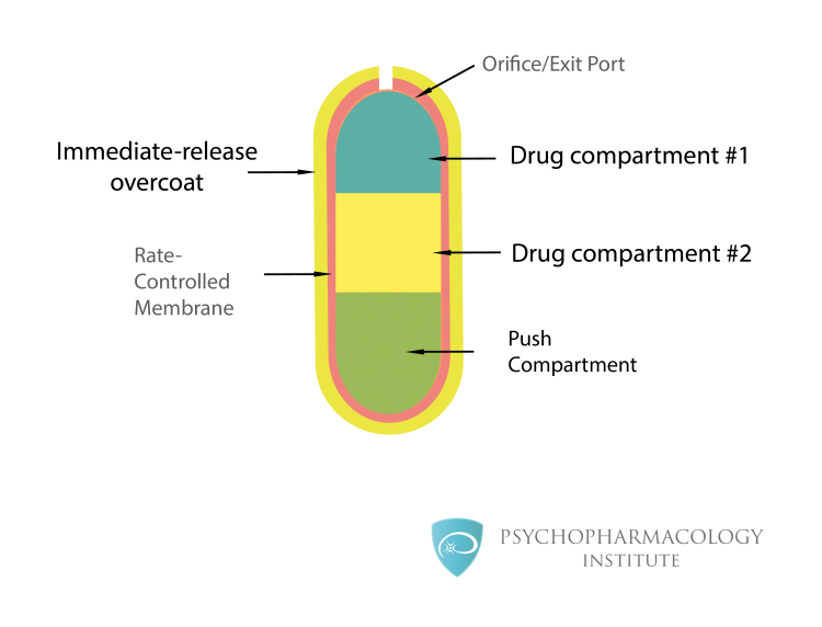 This image shows methylphenidate osmotic release technology. The yellow outer layer contains an immediate release methylphenidate overcoat. The extended release portion has two drug compartments, there is also a push compartment.
